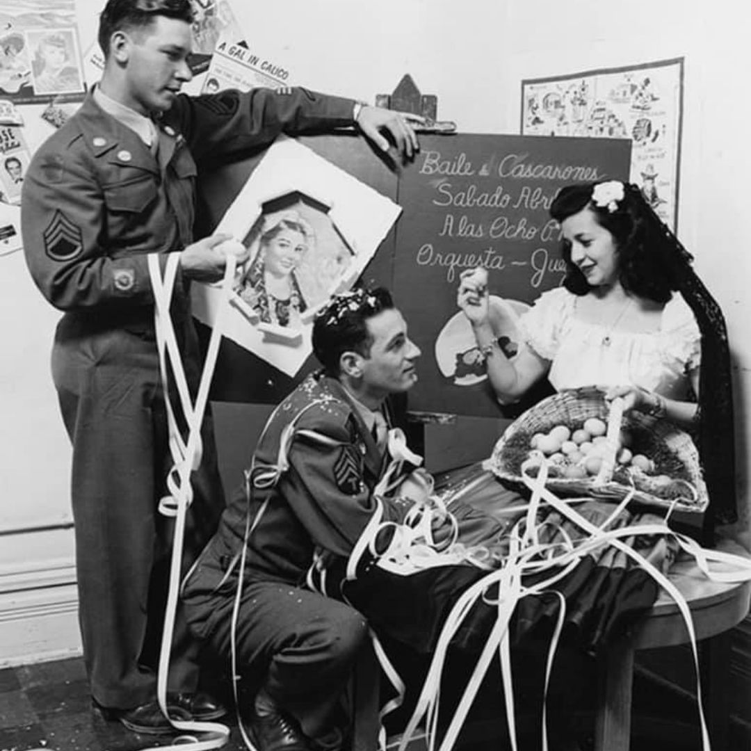 Eggshells were emptied of their contents by piercing two small holes on either end, using something like a sewing needle or small nail, then gently blowing out the contents. Shells were then carefully washed, air-dried, delicately (and I’m sure painstakingly) filled with home-made confetti, and elaborately decorated. By the date of the dance, dozens and dozens of cascarones were ready for the occasion. At the dance the eggs were used as decorations, placed on tables as centerpieces and in baskets throughout the hall. However, the real fun was found in smashing the eggs over someone’s head (hopefully gently) as an invitation to dance. You can imagine the hall by the end of the evening, a colorful, crunchy mess and everyone showered in confetti!