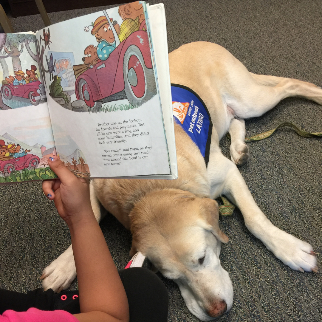 Besides books about animals, another offering for the young animal enthusiast at Vista Grande Public Library is our Wags and Words program. Participants come in by appointment to read to a therapy dog. Our current canine reading specialist is Latigo, a yellow Lab who is the sweetest, gentlest guy, and has a great love for books.