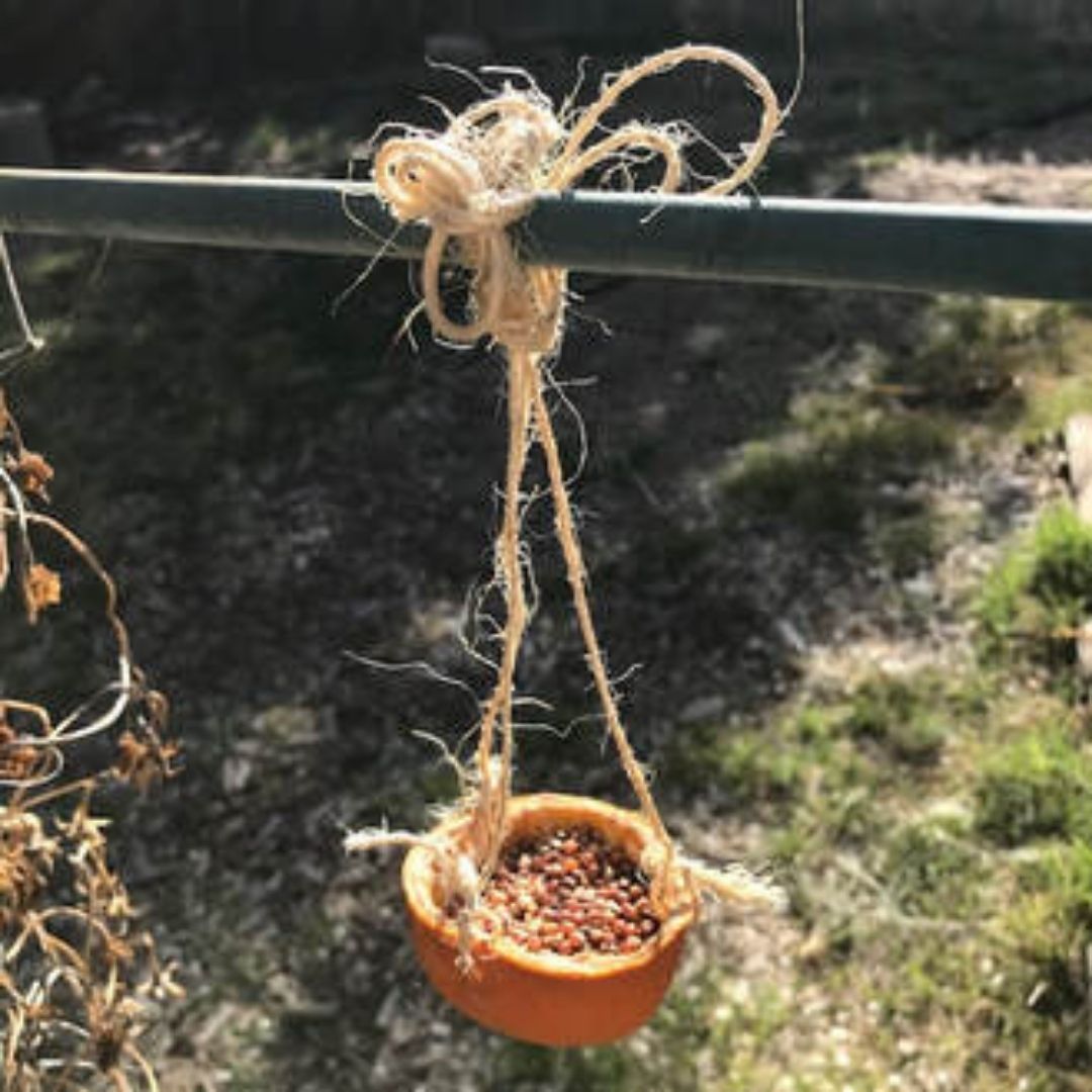 In the second video, In a New Mexico Garden, Part 2, we show you how to make a little hanging birdfeeder out of an orange peel. All you need for this will be an orange, paper towels, a bowl to put the fruit in, a screwdriver or something pointy (but not too sharp) to put holes in the orange peel, some string and some bird seed. When you’re done, you’ll have a colorful little feeder that the birds will love.